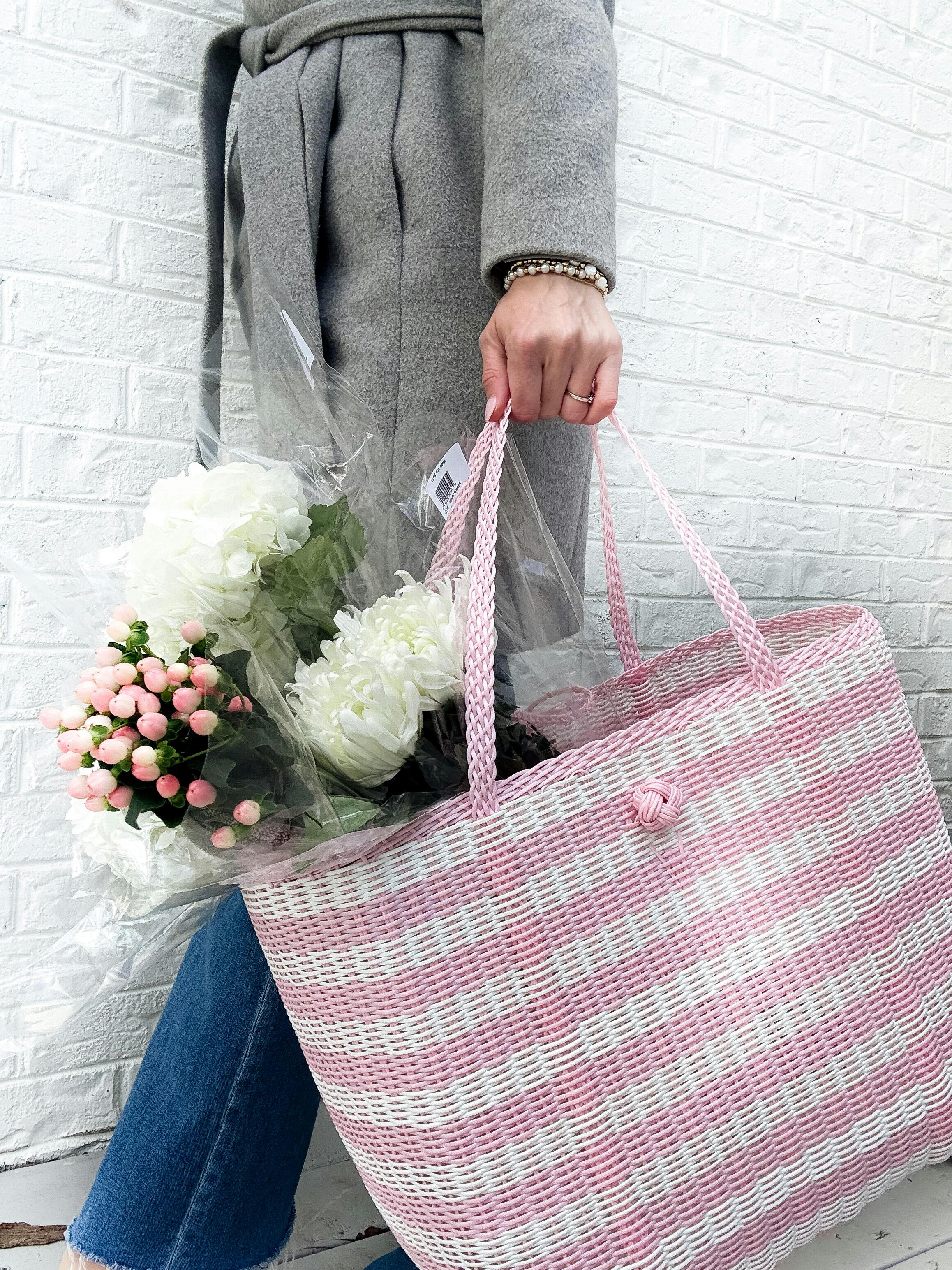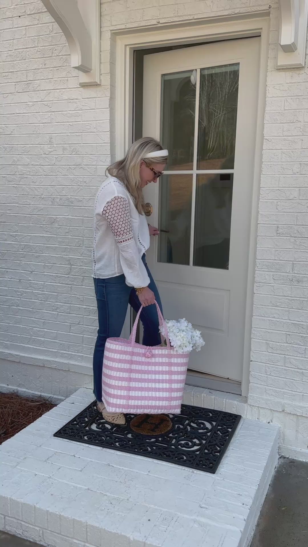 This medium is a bestseller! We love using it everyday for the grocery, work, school and weekend hauling. At the grocery, barn, pool, or beach, it stands tall and never collapses. The handles are woven continuously around and through the basket so it can carry any weight. It’s also the perfect travel bag and looks fabulous at your destination whether that is a beach vacation or ski resort. Sand dusts through it and snow drains away. The sturdy plastic is washable and will never fade or falter. You will love this forever.