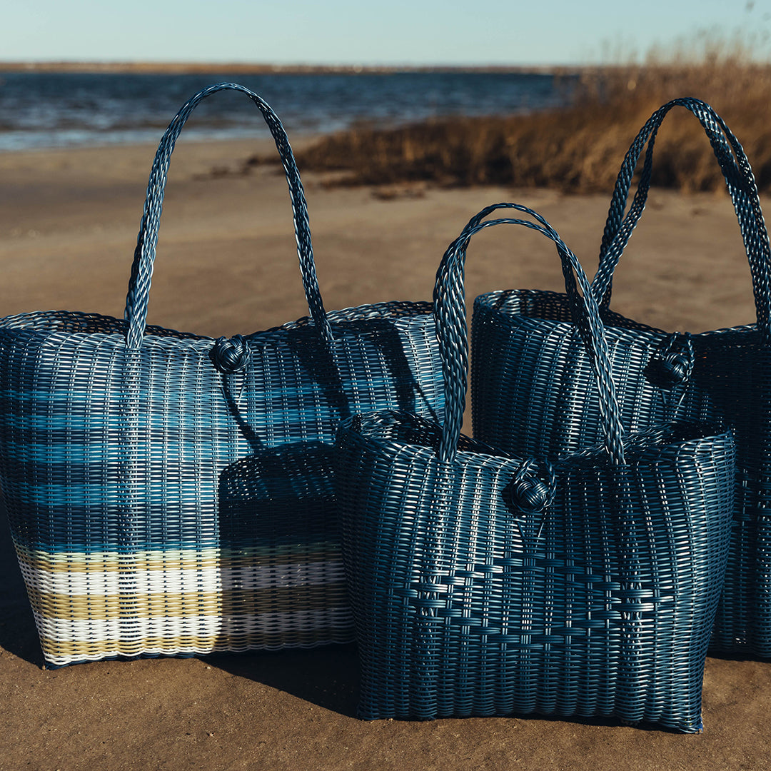 Medium is our bestseller and Fog Blue is a year round favorite color! We love using it everyday for the grocery, work, school and weekend hauling. At the grocery, barn, pool, or beach, it stands tall and never collapses. The handles are woven continuously around and through the basket so it can carry any weight. It’s also the perfect travel bag and looks fabulous at your destination whether that is a beach vacation or ski resort. Sand dusts through it and snow drains away. The sturdy plastic is washable and will never fade or falter. You will love this forever.