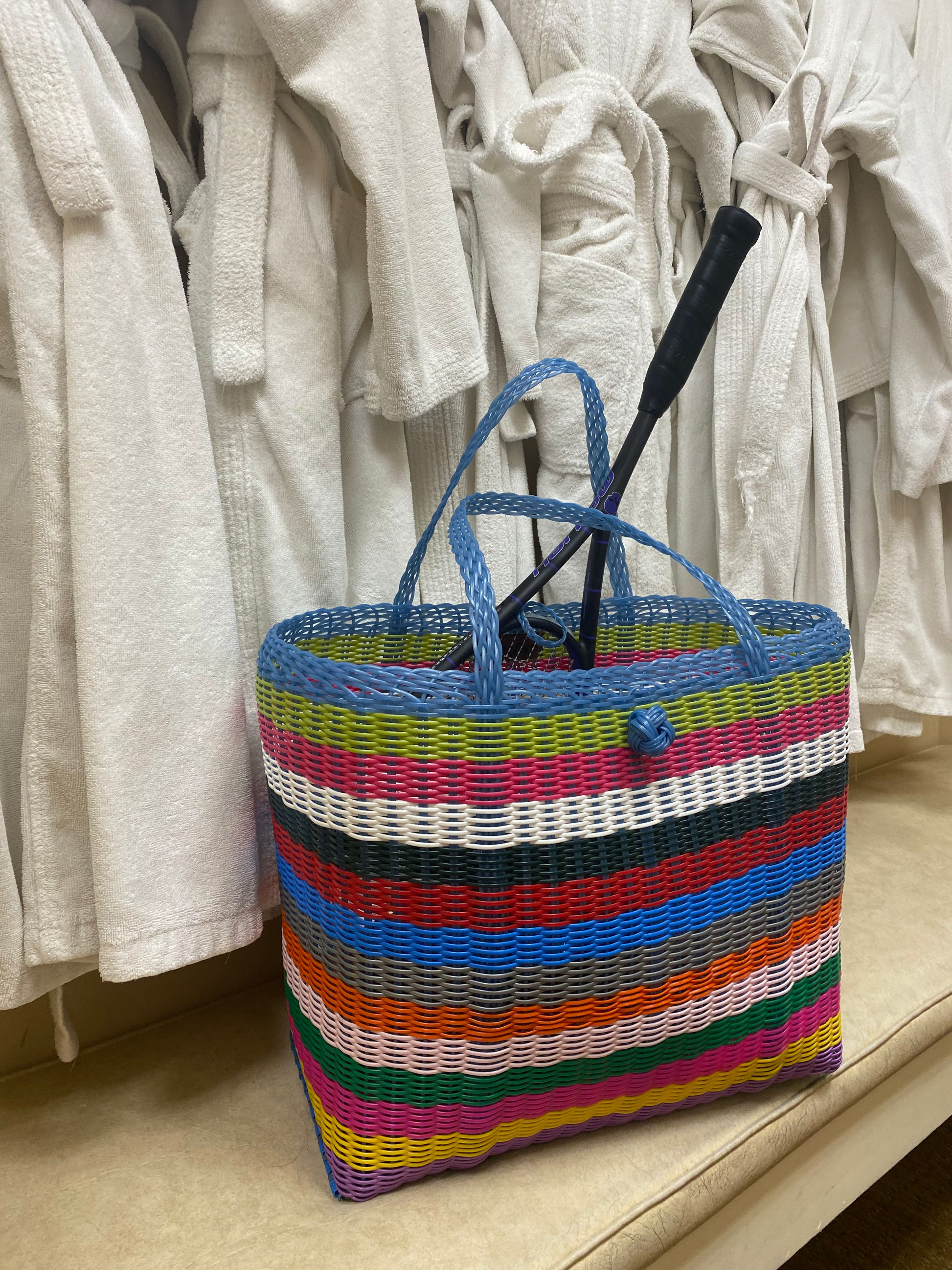 This tote is sure to please! It will brighten your everyday tasks. We love using it for the grocery, work, school and weekend hauling. At the market, barn, pool, or beach, it stands tall and never collapses. The handles are woven continuously around and through the basket so it can carry any weight. It’s also the perfect travel bag and looks fabulous at your destination whether that is a beach vacation or ski resort. Sand dusts through it and snow drains away. The sturdy plastic is washable and will never fade or falter. You will love this season after season!