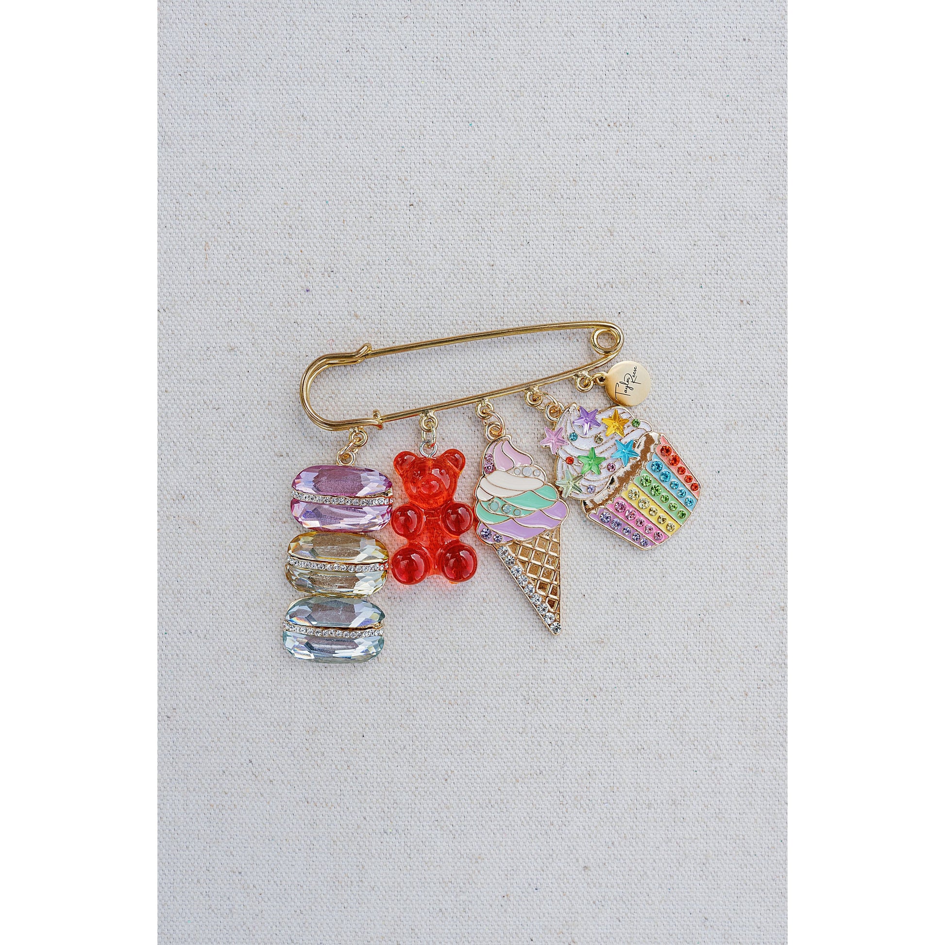 Treat yourself—literally. The Sweet Tooth bag charm pin is a sugar-dusted dream come true, featuring a candy-colored lineup of whimsical confections: a glittering cupcake, a pastel stack of macarons, a glossy gummy bear, and a rhinestone-swirled ice cream cone. Each charm hangs from a luxe gold safety pin with the signature TR logo, ready to sprinkle joy on any bag or strap.