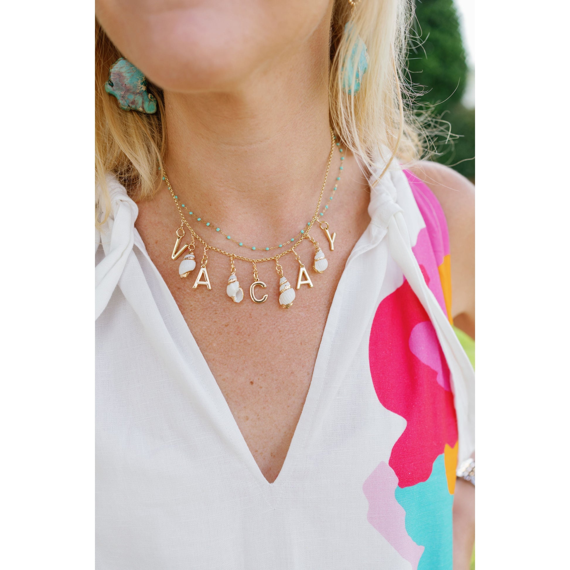 - 🌴 VACAY gold letter charms with luxe white shell accents